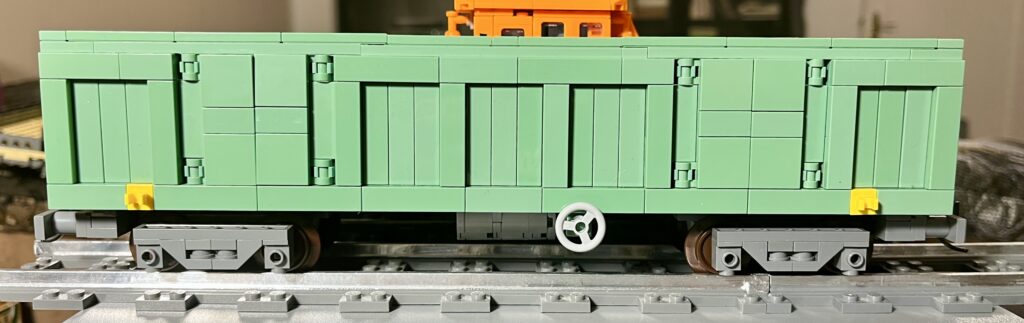 The bogies can also be built with different coupling systems. For example, Kadee Coupler 743Z from Brick Model Railroader is installed in one bogie and standard Lego couplers in the other.